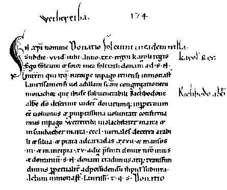 Donatio Folcuini in eadem villa In Christi nomine sub die VI id iulli anno XXX regni Karoli regis ego Folcuin et sorror mea Folcrath donamus ad s. N. mrem .... lauressamensi uel ad illam sanctum congregationem monachorum que ibidem sub ueneralbili Richbodone abbate deo deseruire donatumque ...confirmans in pago Wettereiba in Alastater marca et in Ganbacher marca CCCL de terra arabili et silua, et prata ad carradas XXVII et mansos III et mancipia XV a die presenti de iure nostro in ius et dominum s. N. donamus tradimus atque transfundimus perpetualiter...